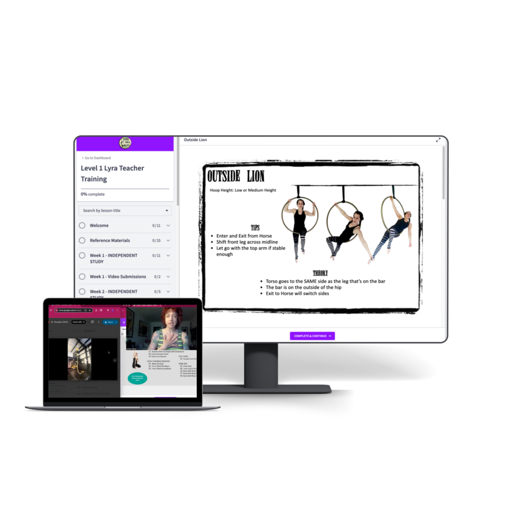 Short, focused modules you can complete at your own pace, but guided by a clear weekly schedule that aligns with our live Zoom sessions. Lectures and readings that cover foundational concepts like rigging, safety, functional anatomy, injury prevention, class management, spotting theory, and our Vertical Theatre Method.