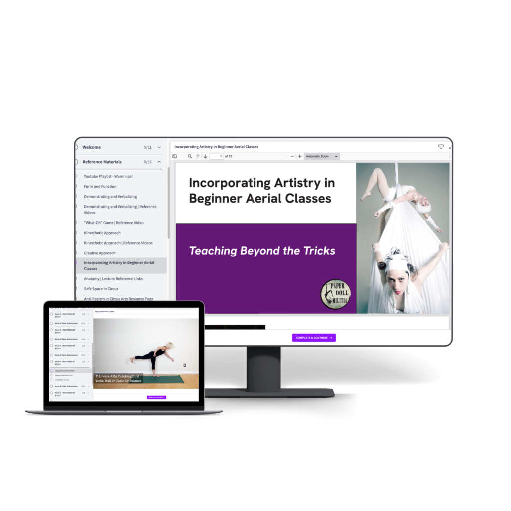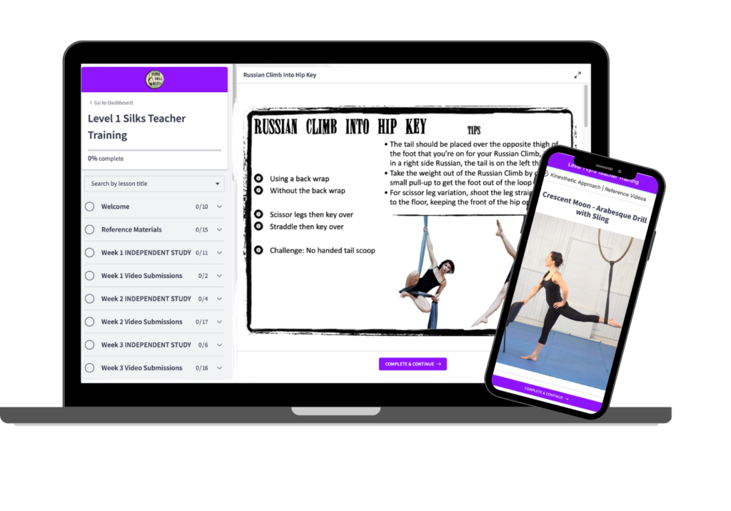 You’ll learn biomechanics, progressions, cueing, classroom management, spotting, safety, creativity tools, and more, all inside a supportive community of like-minded aerialists.